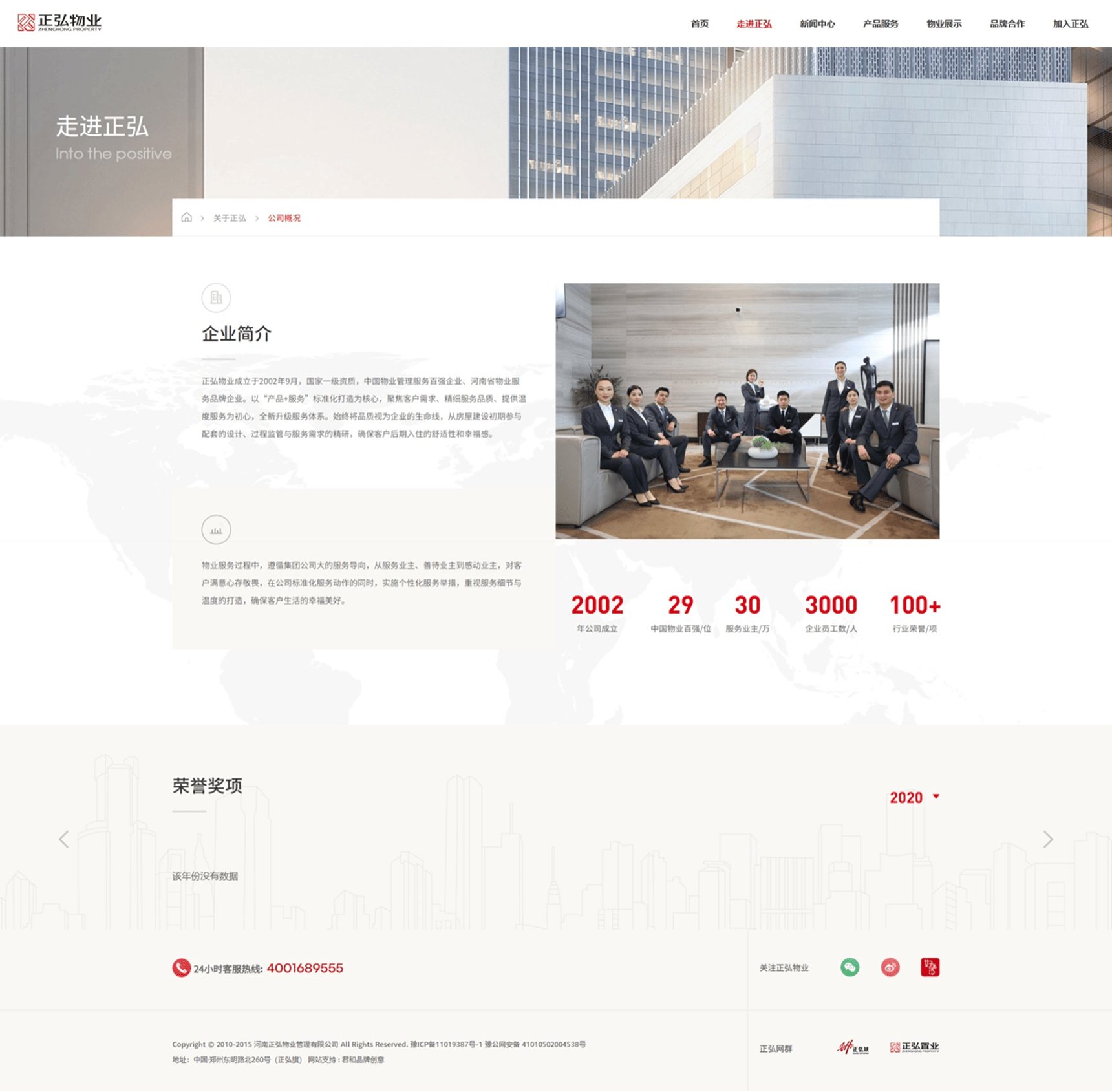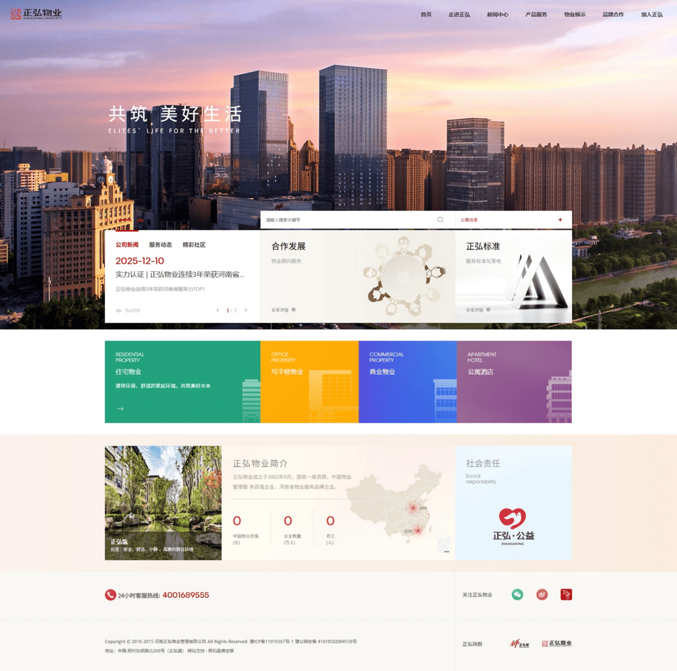 河南正弘物业管理有限公司成立于2002年9月,注册资本550万元,国家一级资质、中国物业管理服务百强企业、河南省物业服务品牌企业。公司管理物业类型涵盖高层住宅、写字楼、别墅、公寓、酒店、商业、城市综合体等。