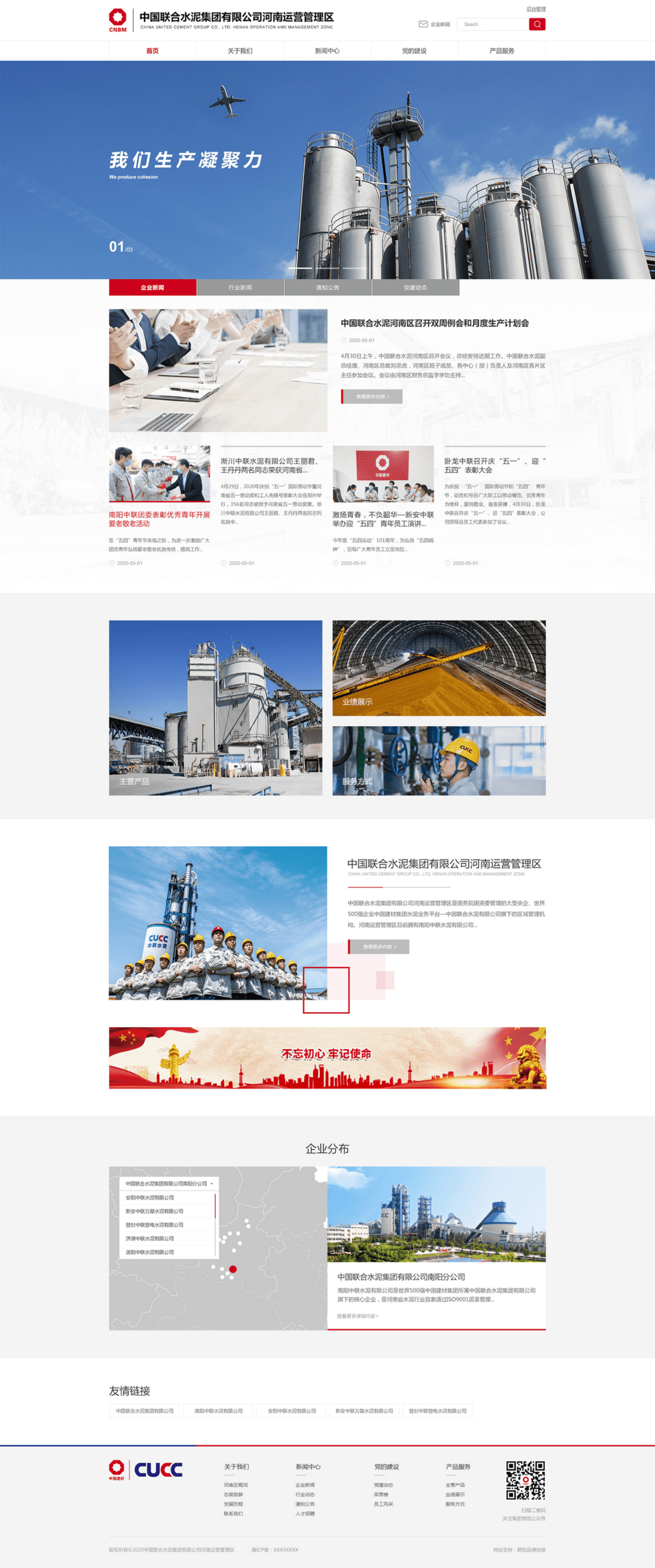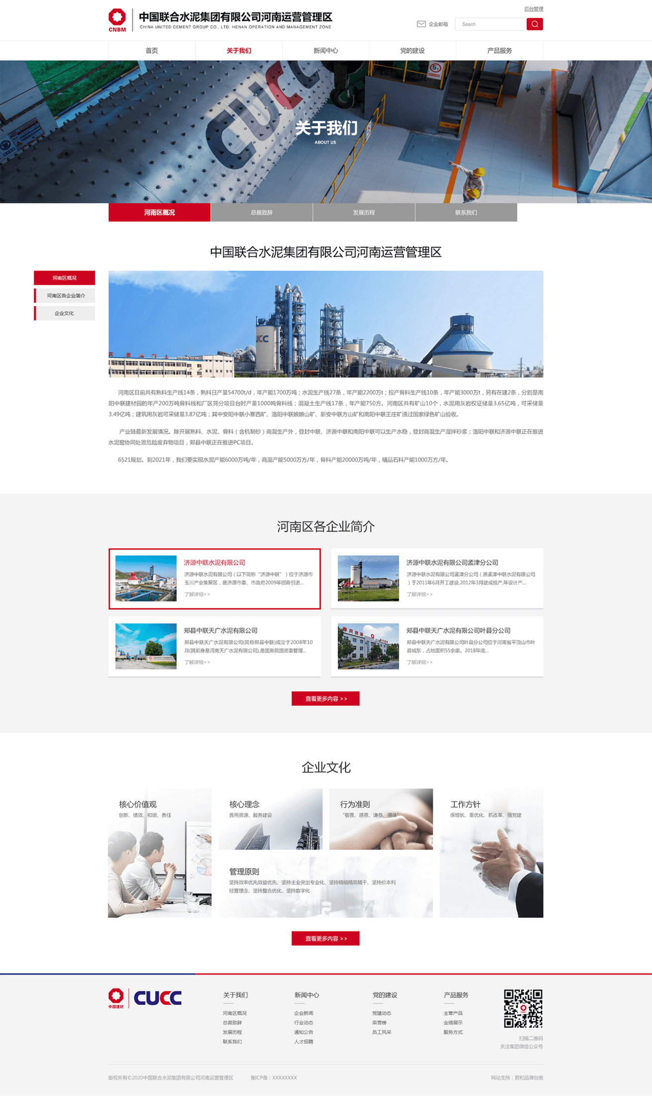 中国联合水泥集团有限公司(简称“中国联合水泥”)成立于1999年,是中国建材的核心企业,是集水泥、商品混凝土、砂石骨料、水泥制品等制造及研发、节能环保与综合利用为一体的国家重点扶持的大型水泥企业集团。中国联合水泥拥有全资及控股企业近100家,分布于山东、江苏、河南、河北、安徽、山西、内蒙古、四川、北京等省市自治区。水泥年产能1.2亿吨,商品混凝士年产能2亿立方米,骨料年产能近1亿吨,总资产近800亿元人民币。